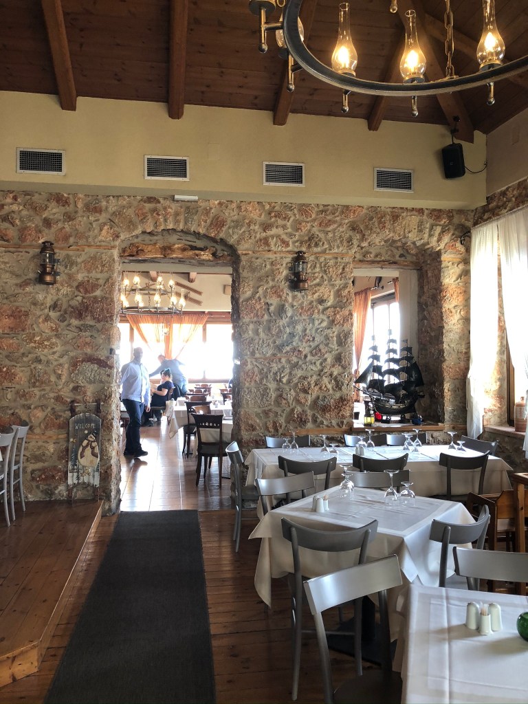 The tiny town of Delphi with its two roads running parallel, hanging on cliffs and connected by steep staircases, was the perfect spot for a lunch of salad (Greek with tomatoes and feta cheese) and traditional roasted rooster cooked in red wine called kokoras kokkinisto (not chicken, but who could really tell?)